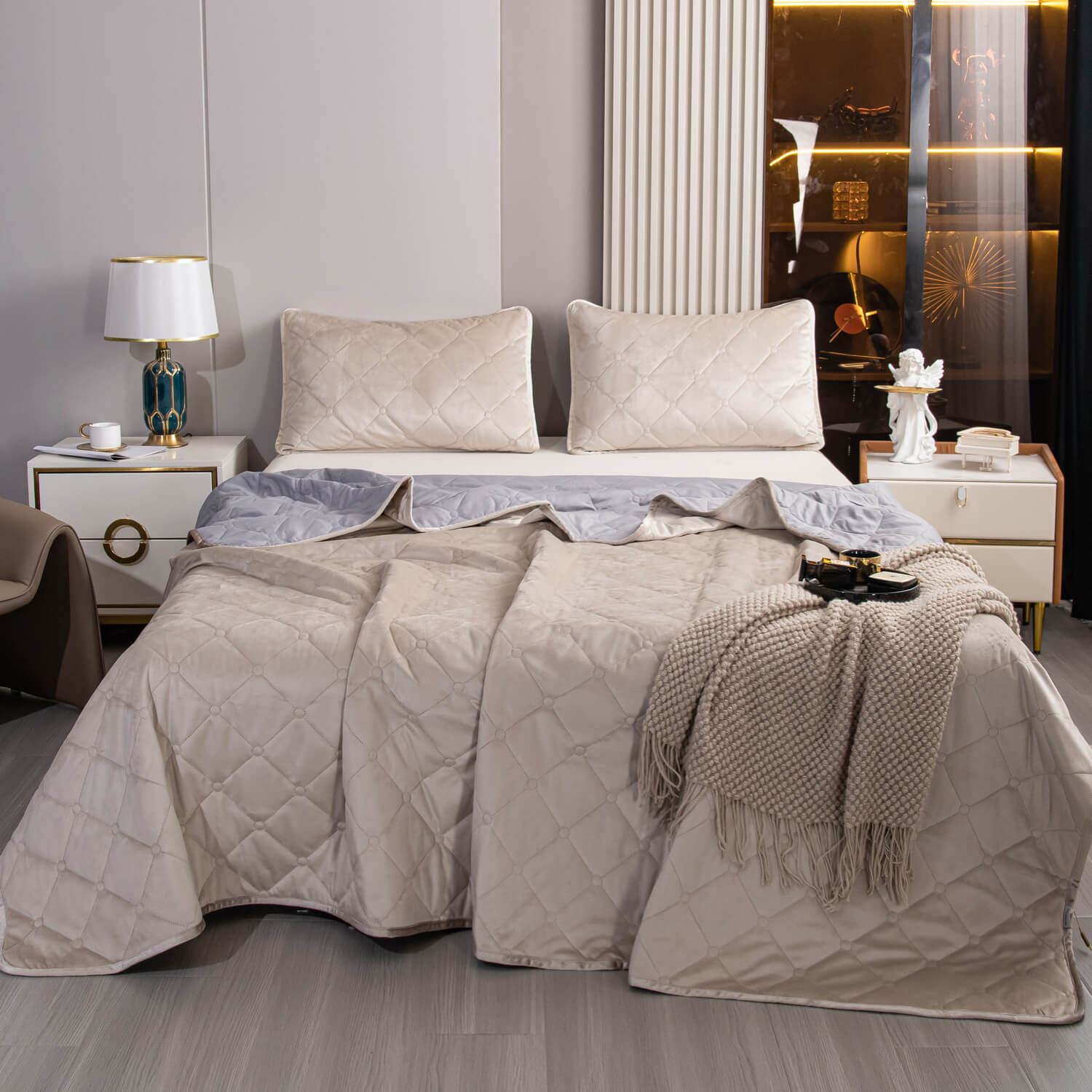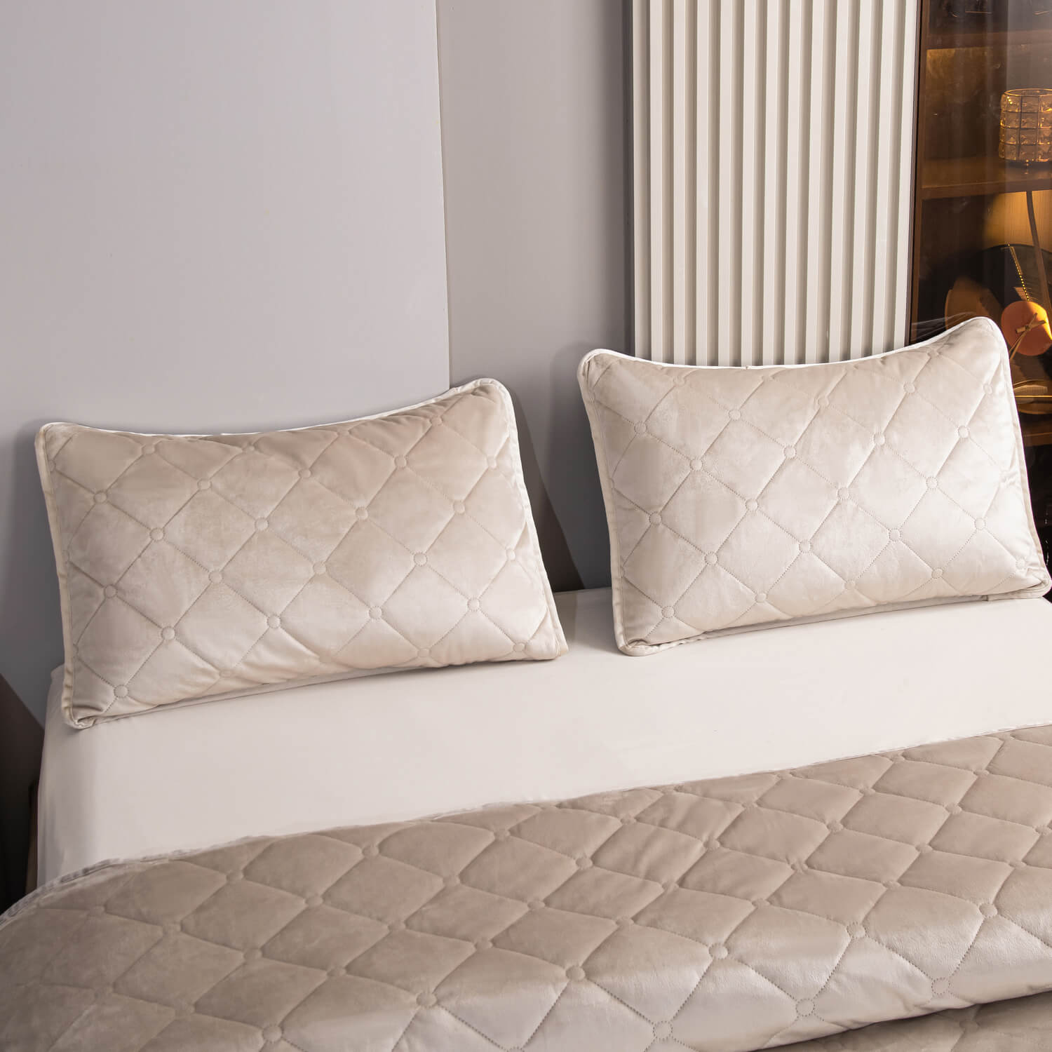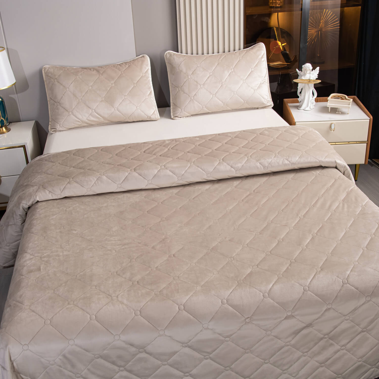 Велюровое покрывало ромб и две наволочки (Бежевый)
